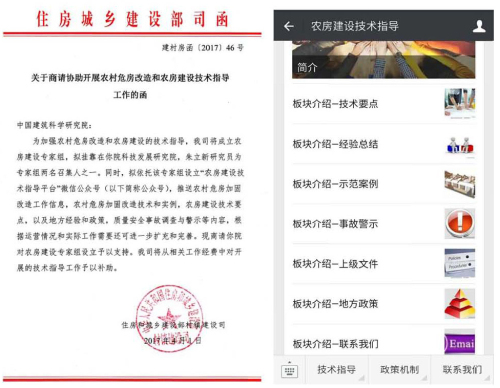 為配合專家組工作的開展,受住房和城鄉(xiāng)建設(shè)部村鎮(zhèn)建設(shè)司委托,依托專家組設(shè)立“農(nóng)房建設(shè)技術(shù)指導(dǎo)”微信公眾號,致力于農(nóng)房建設(shè)知識普及化、技術(shù)指導(dǎo)精準(zhǔn)化,搭建上下互通,技術(shù)指導(dǎo)與示范建設(shè)協(xié)調(diào)并進的平臺。微信公眾號由住房和城鄉(xiāng)建設(shè)部村鎮(zhèn)建設(shè)司主導(dǎo),我院科技發(fā)展研究院負(fù)責(zé)日常運營和管理,各地方村鎮(zhèn)建設(shè)管理部門和技術(shù)指導(dǎo)專家定期或不定期上傳相關(guān)信息,配合和支持公眾號的運營。